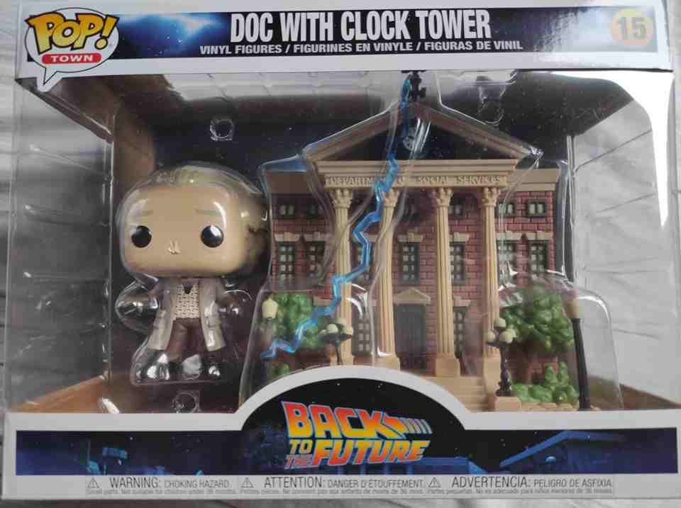 La funko pop moment in questione ritrae il Doc Brown del passato (1955) accanto alla torre dell’orologio ( ancora funzionante) del tribunale di Hill Valley con già il cavo elettrico tirato.
