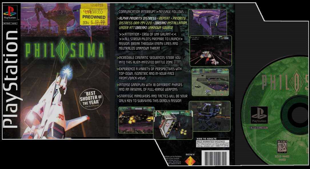 Philosoma è un videogioco per PlayStation, uscito nel 1995 e pubblicato da Sony Computer Entertainment America. È stato ripubblicato su PlayStation Network in Giappone il 26 aprile 2007. E’ stato uno dei primi giochi per PlayStation, accolto con recensioni mediocri, con la maggior parte dei critici che giudicava la sua grafica mediocre e il suo gameplay primitivo.Personalmente all’opposto mi e’ piaciuto molto, complice le sequenze Cg che trascinavano la storia e la varietà delle situazione dovute alle prospettive di gioco.E’ stato il primo primo gioco Psx ed anche devo ammetterlo uno dei pochi giochi che ho realmente finito.